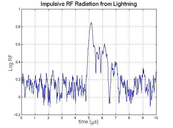 To determine the 3-dimensional structure and temporal development of a lightning discharge the system utilizes the basic technique employed by the LMA that has been developed and operated at Kennedy Space Center by Carl Lennon and Launa Maier. The LMA uses time of arrival measurements to locate impulsive VHF radiation events during a discharge. The following figure shows the VHF radiation for a portion of a typical lightning discharge. The sharp peaks in the Log RF plot are produced by impulsive electrical breakdown events in small source regions.