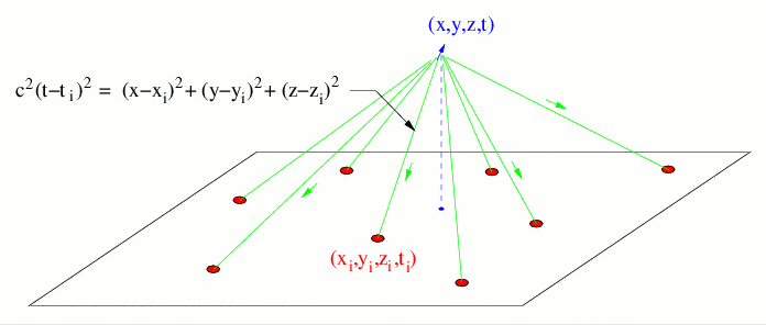 If the time of arrival of the radiation from such an event is measured at four locations, the 3-dimensional position of the source region can be determined. If impulsive radiation occurs at location (x,y,z) and at time t, the time it is received at station i is